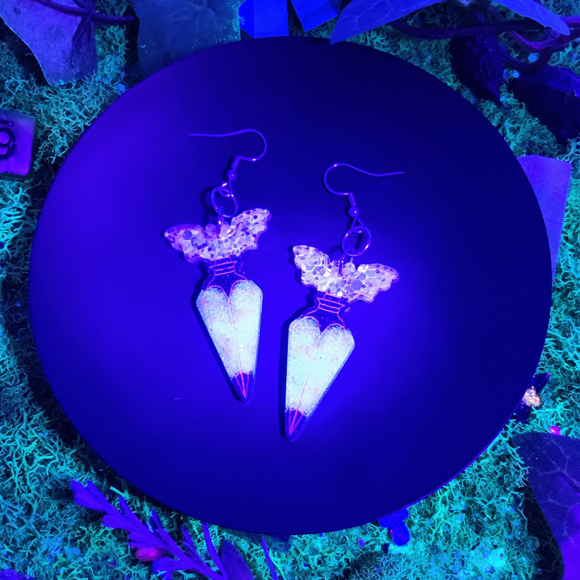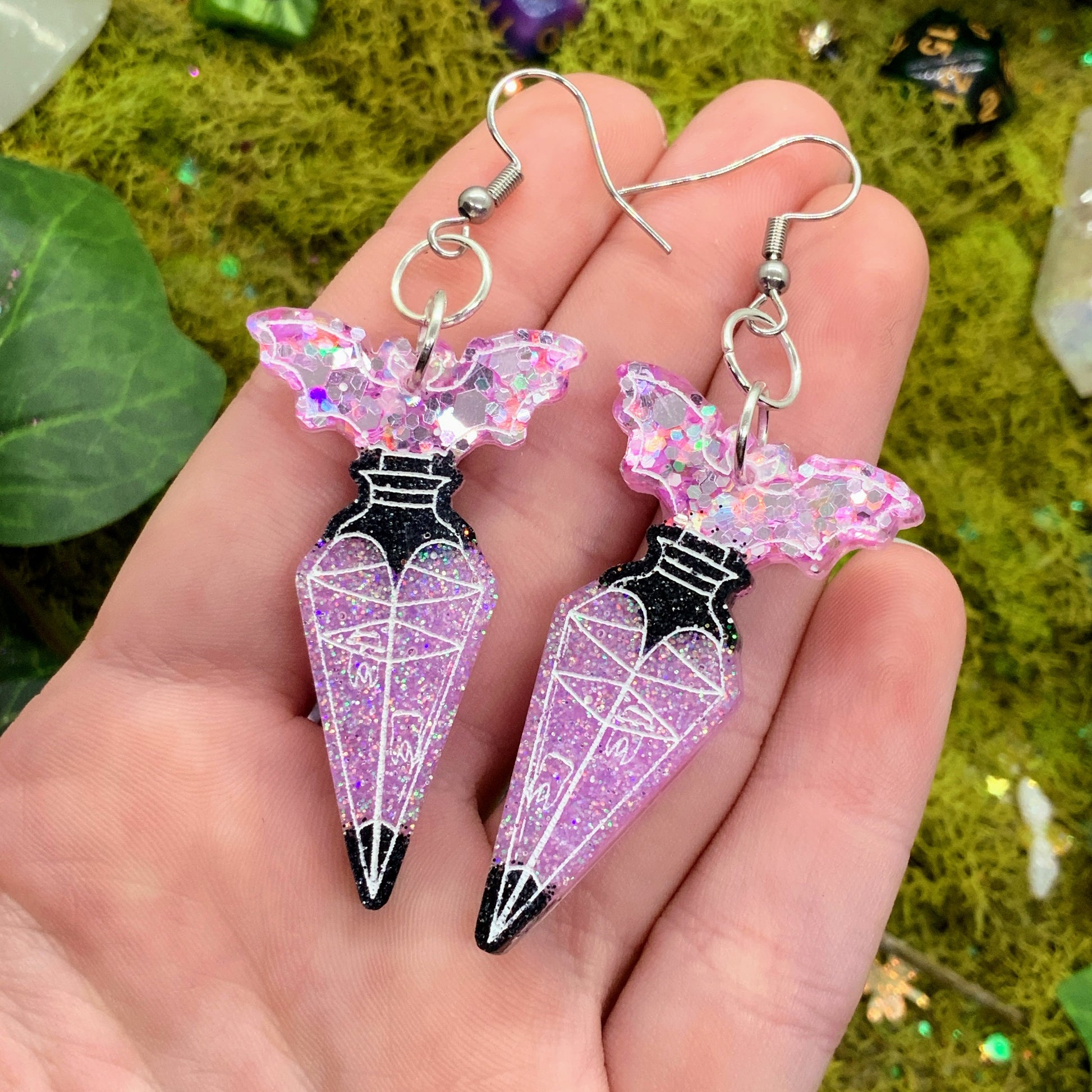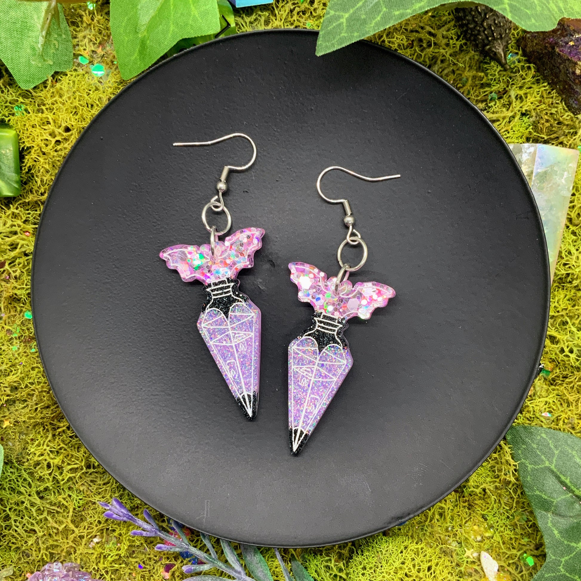 small sized lightweight earrings: pretty potion bottle with a bat topper