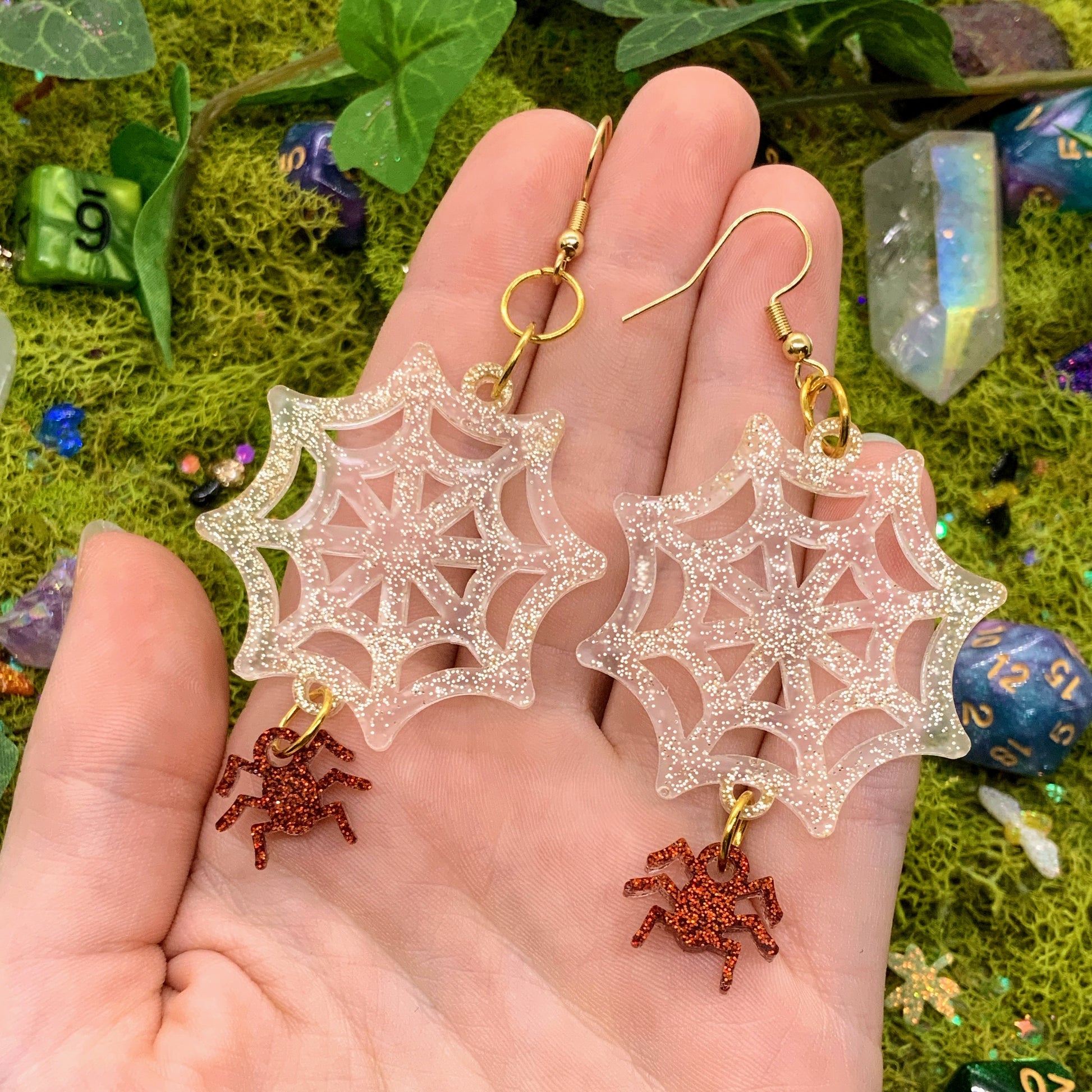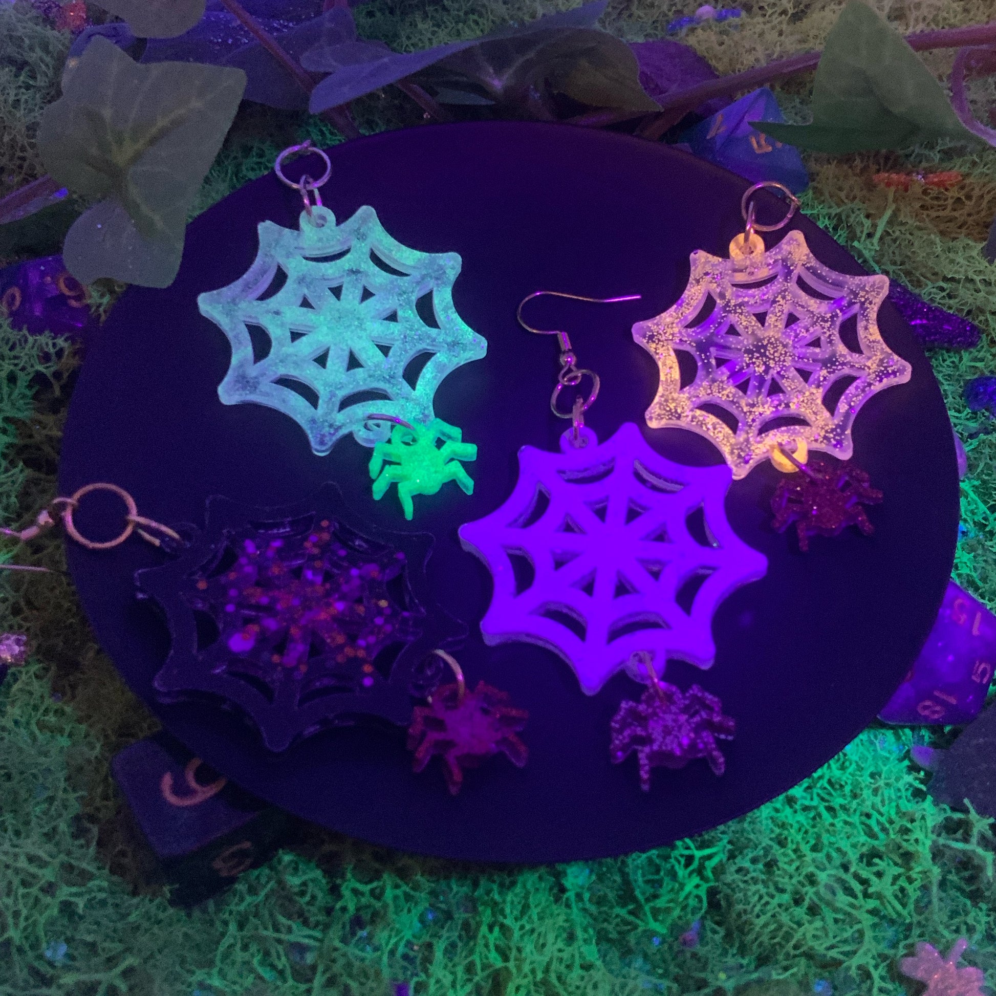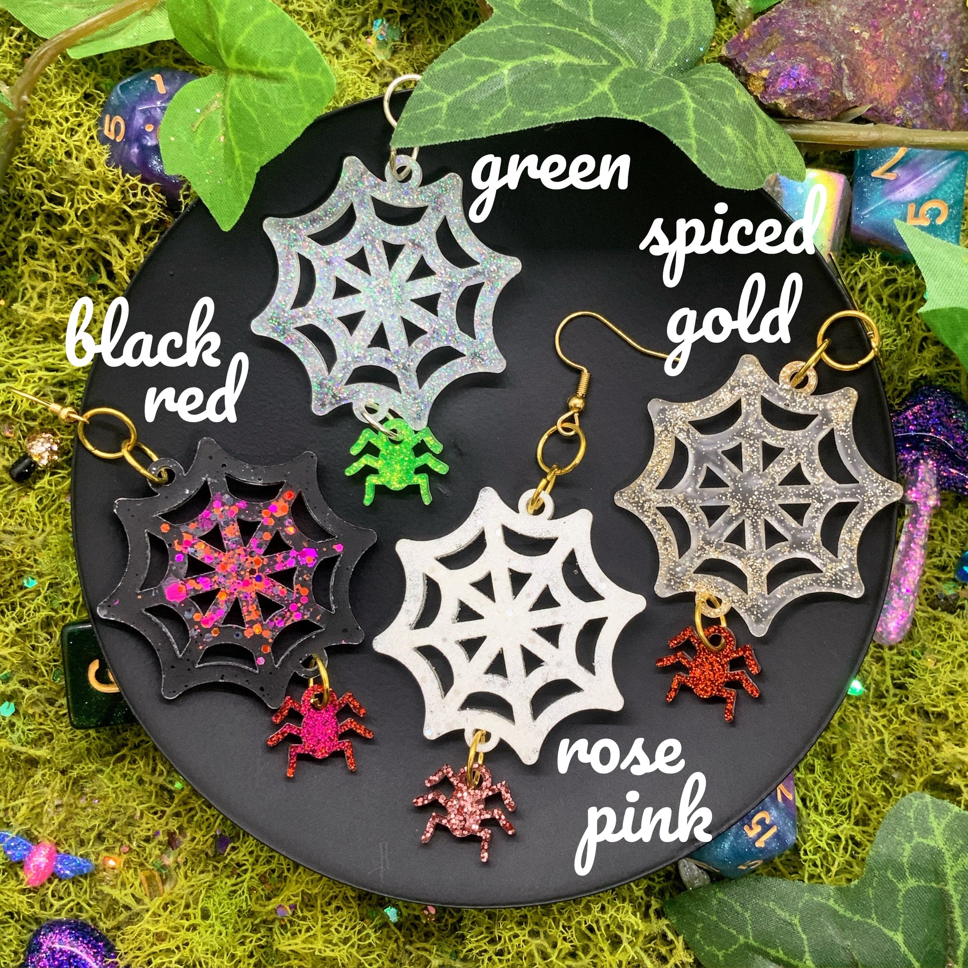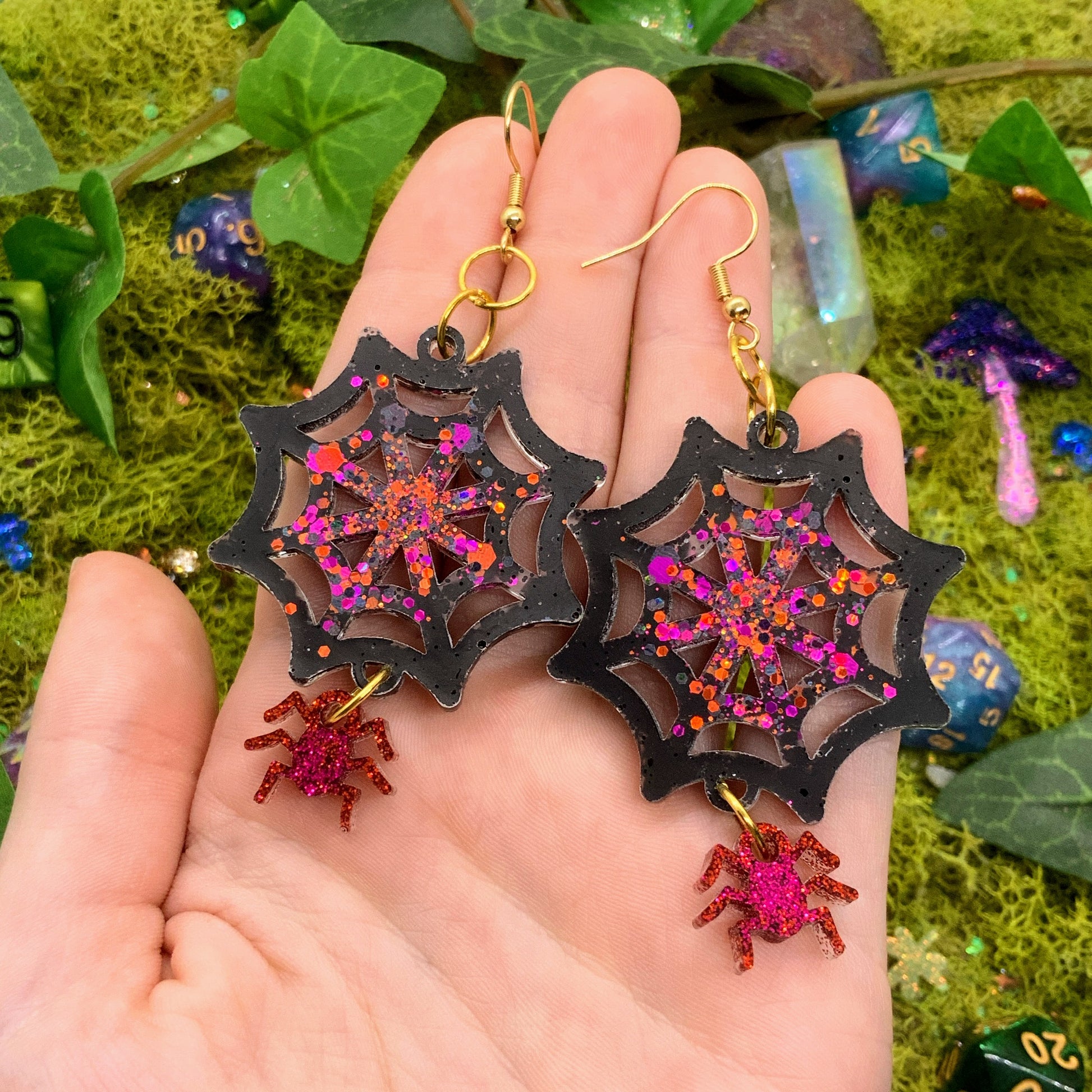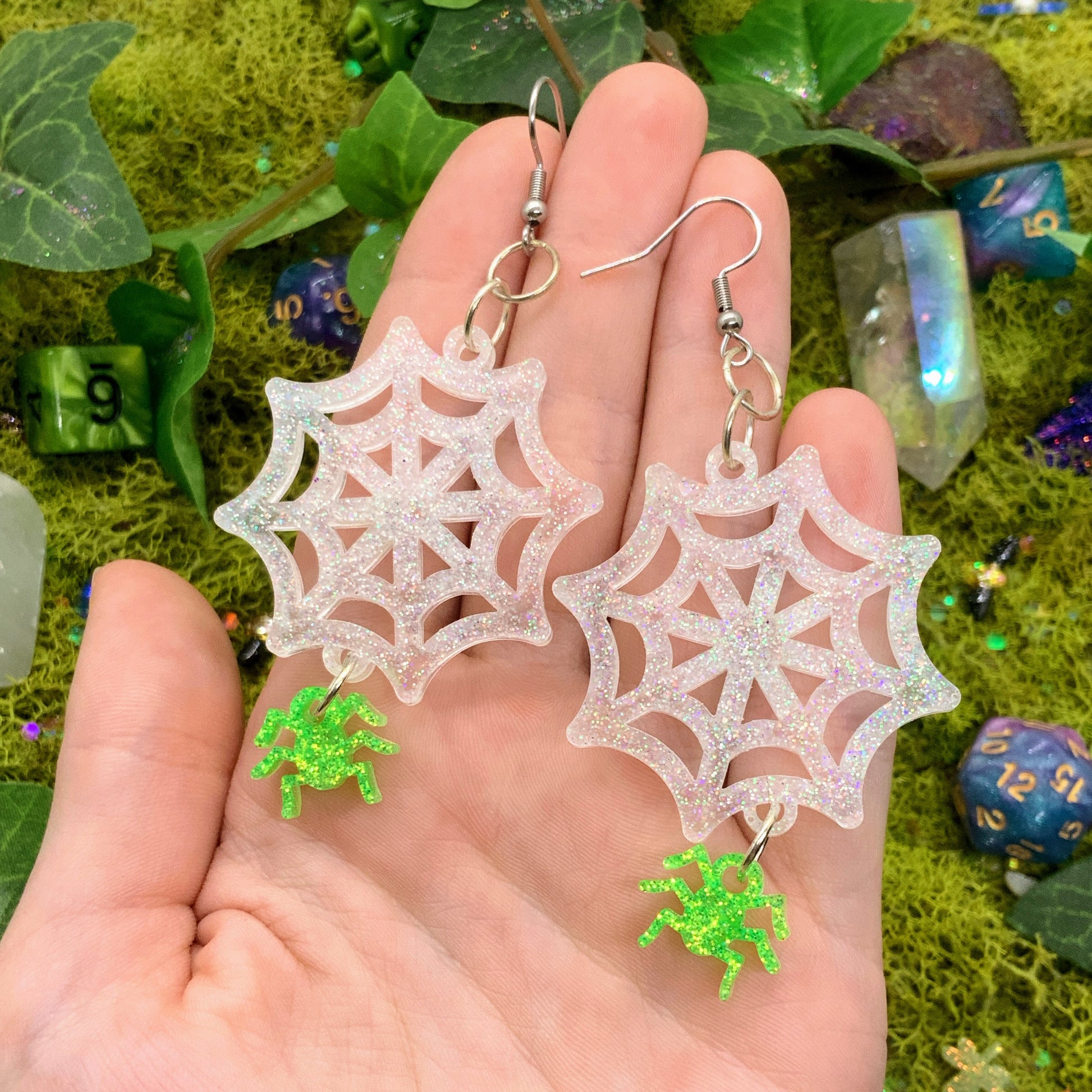 medium-sized earrings! rainbow holographic spider webs with glittery spider charms