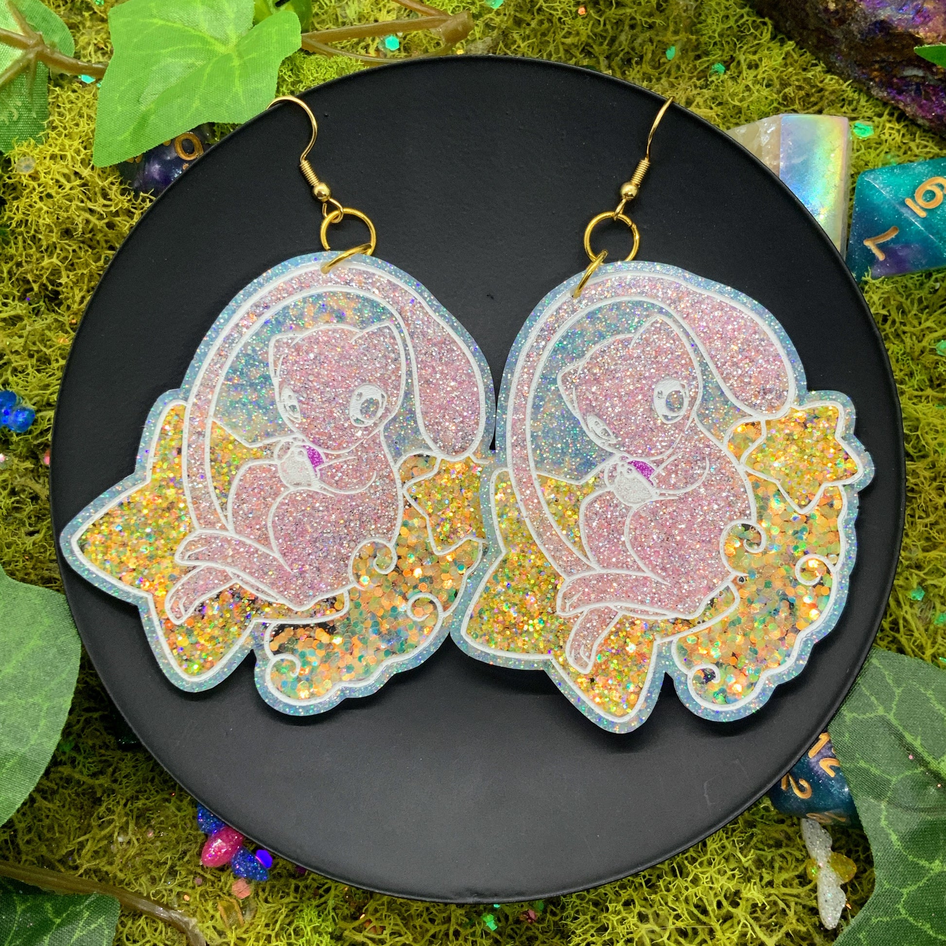 large sized lightweight earrings: mythical guy, this pair has a hand painted gold chrome background and a pastel glittery mew!
