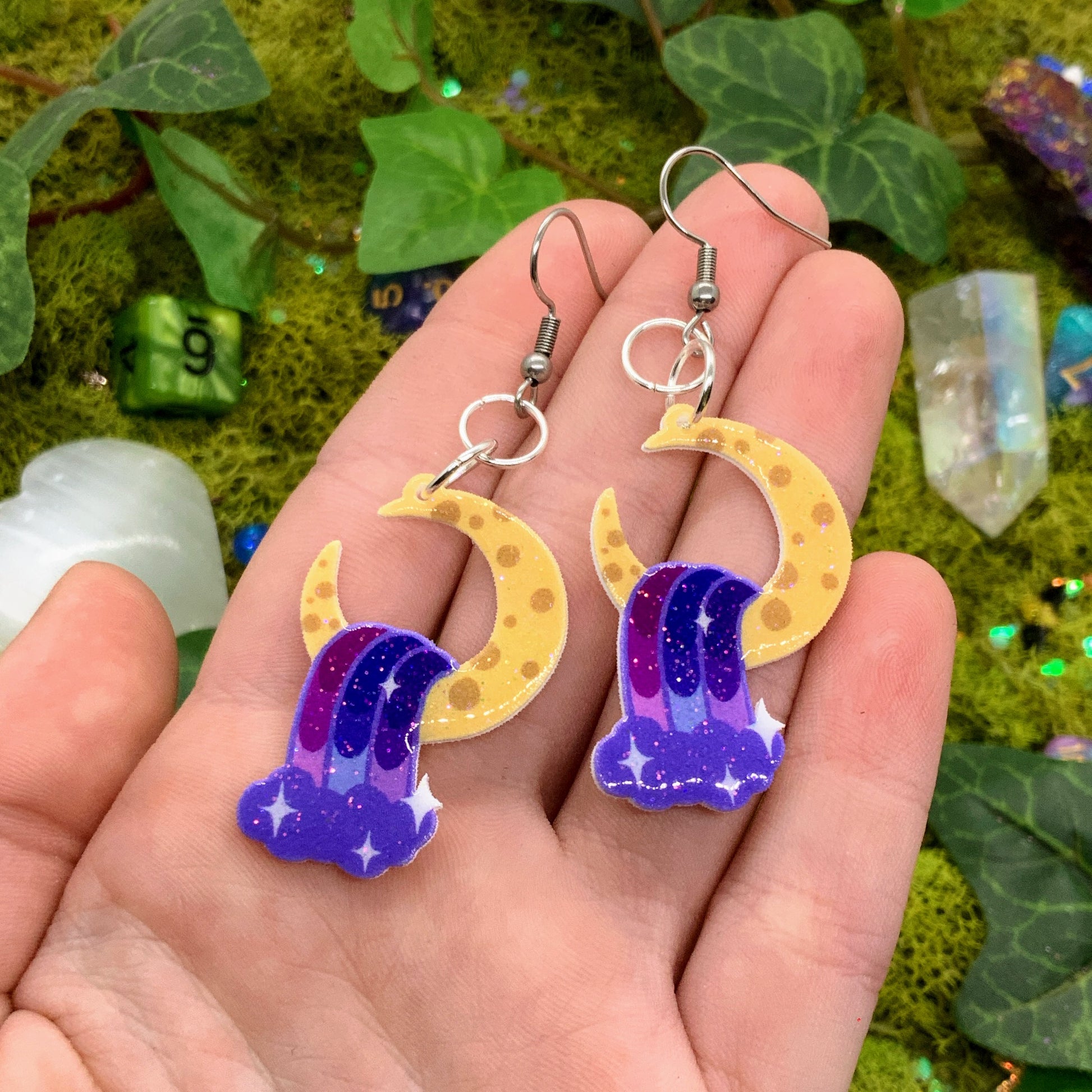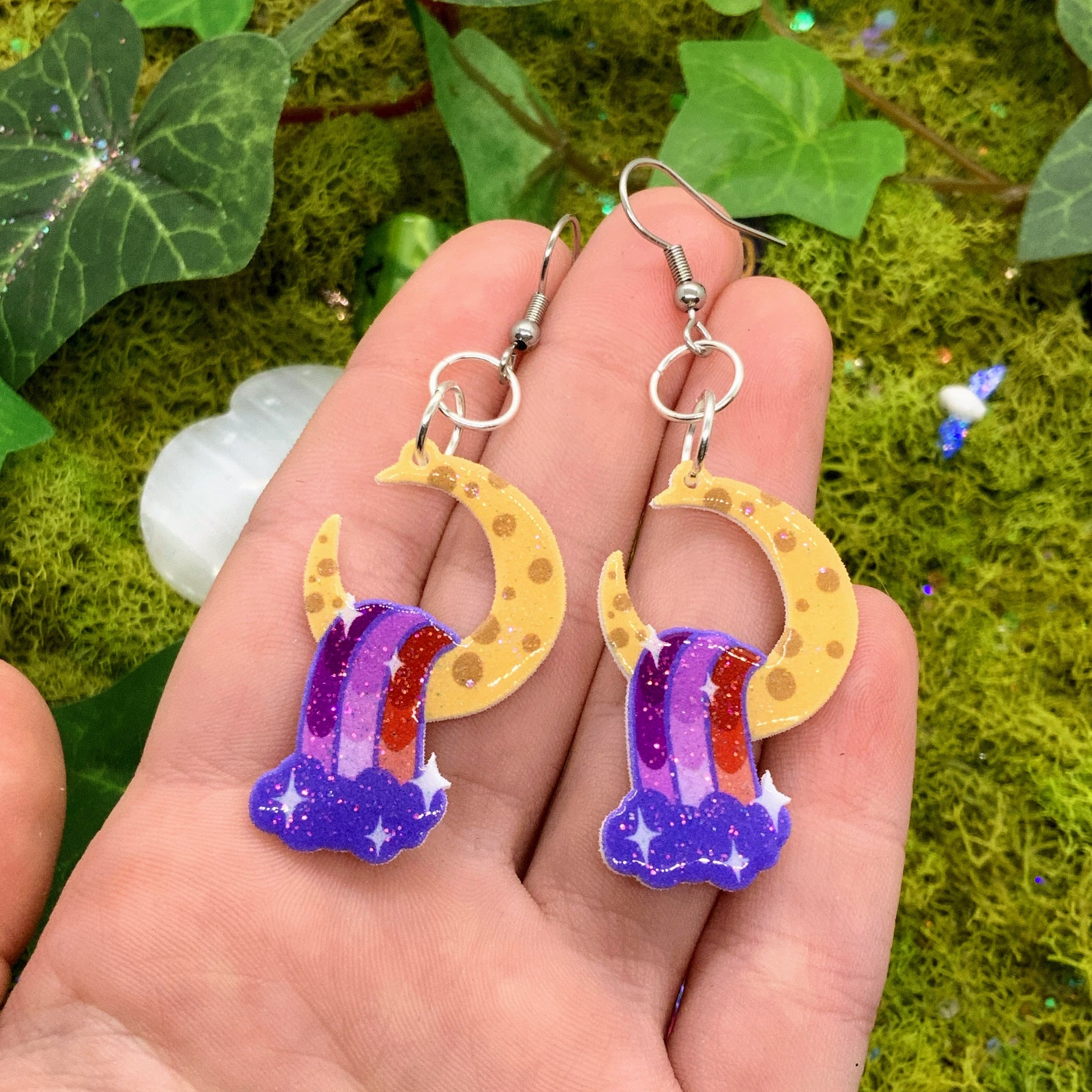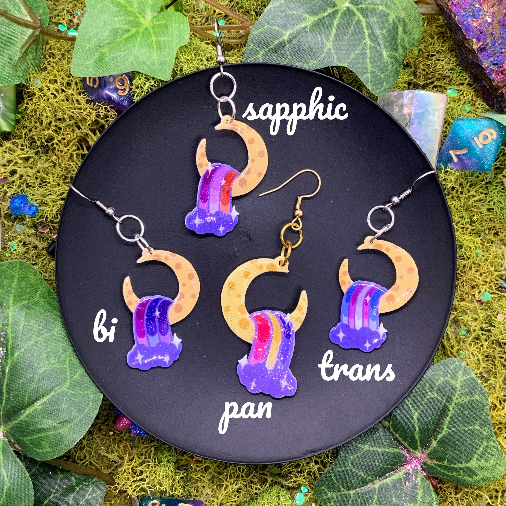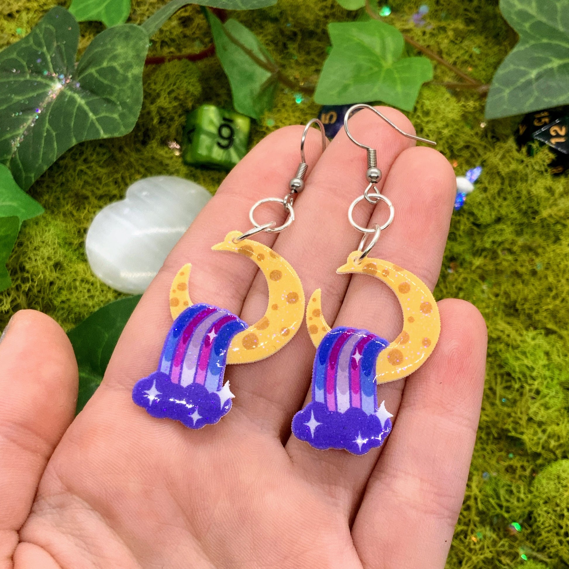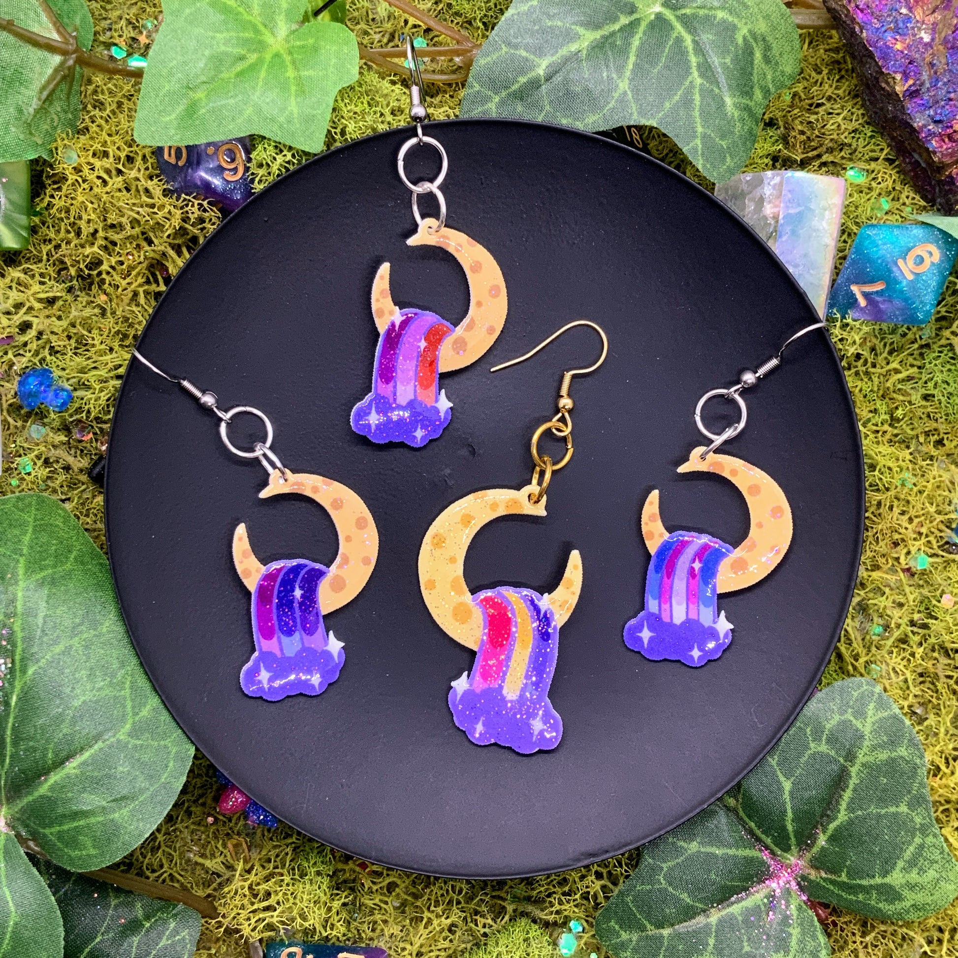 small sized shrink earrings: cresent moon with colorful waterfall, hand-drawn by me :) meant to be subtle pride flags, for anyone!